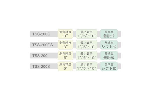 TSS-200シリーズでは測角精度3"と5"のモデルをラインナップ。 また、最小表示は全モデル1”/5”/10”の切替式です。