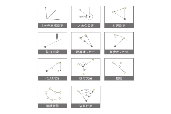 3次元座標測定、杭打測定、オフセット測定、対辺測定、REM測定、後方交会、面積計算、倍角計算、幅杭と、多彩なプログラムを搭載。