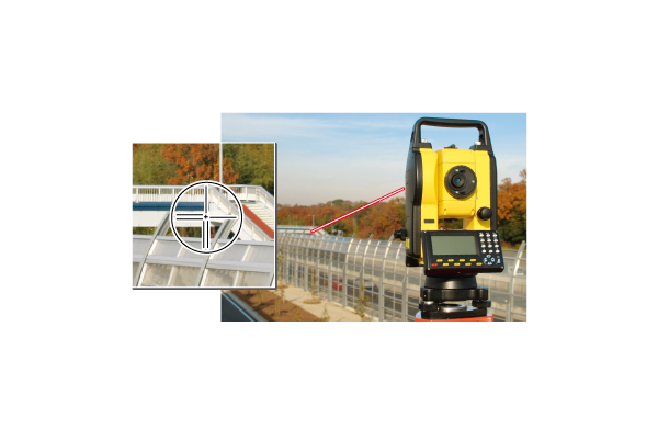 ノンプリズム測距約200m。立ち入りが困難な場所や交通量が多い場所など、直接プリズムを設置できない状況でも測定可能。例えば現況測量において、建物の高さの測定や隣接建物の測定等、測点位置まで行かなくても測定が可能です。