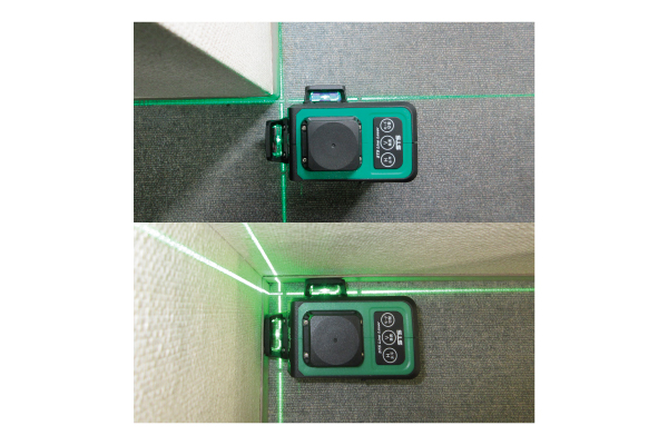 出隅、入隅の壁際にクロスラインレーザーを照射可能。