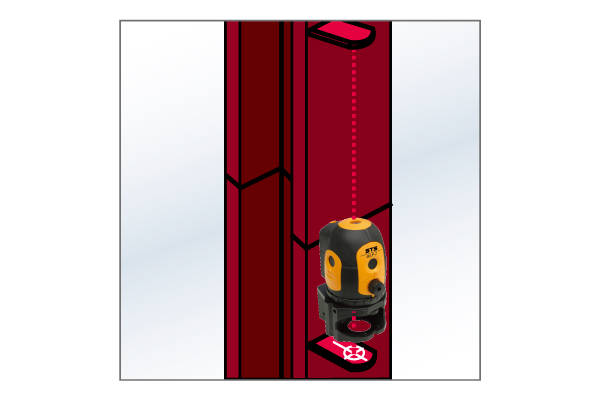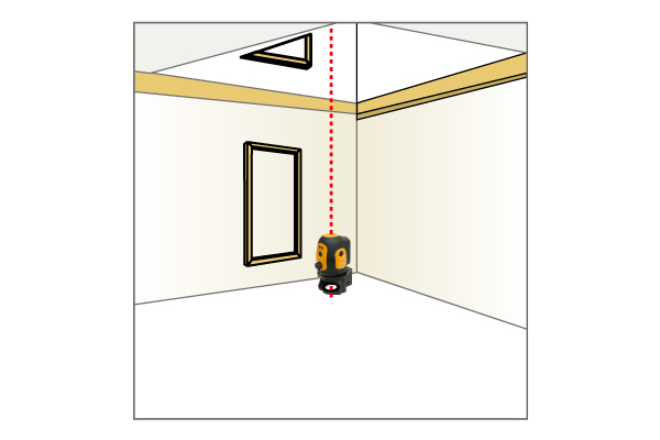 ある程度平らな場所なら本体が自動で補正をし、鉛直点・地墨点を照射します。 また、レーザー照射時に本機が自動補正範囲(±4.5°)以上傾いていると、ブザー音とレーザーの点滅でお知らせします。