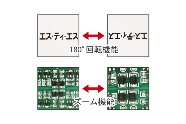 タッチ操作1つで表示画面の180°回転、ズーム機能、表示画面固定が可能です。 (表示画面を固定しての撮影はできません。)