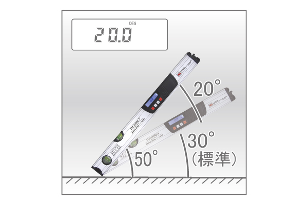 任意の角度を基準0°とし、他の角度との比較表示が可能です。 (例)30°の位置を比較モードで基準0°にした場合、通常モードで50°の位置が20°と表示されます。