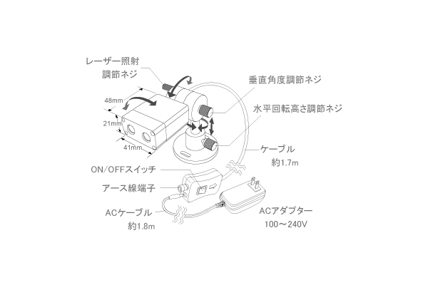 照射角120°の高輝度レーザーを搭載していますが、本機と対象物との高さや角度でレーザーの線長、線幅及び、 明るさは変わります。